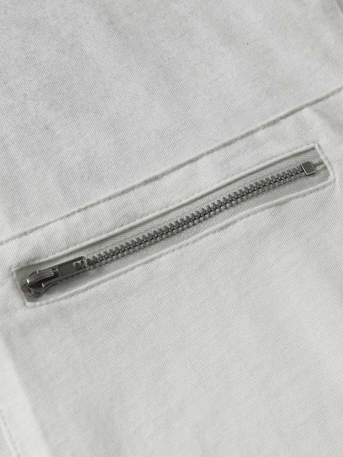 • Design Elements: Chest pocket with zipper closure, distressed holes on sleeves and bottom hem